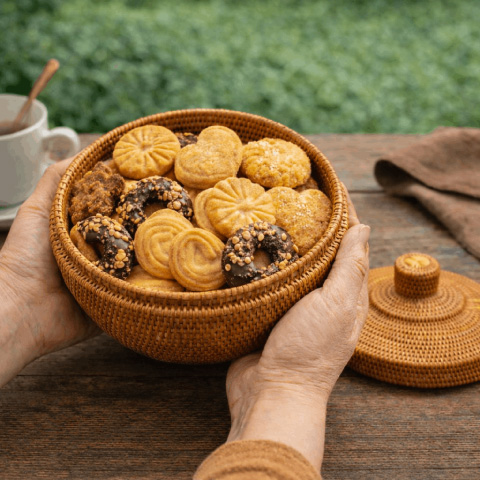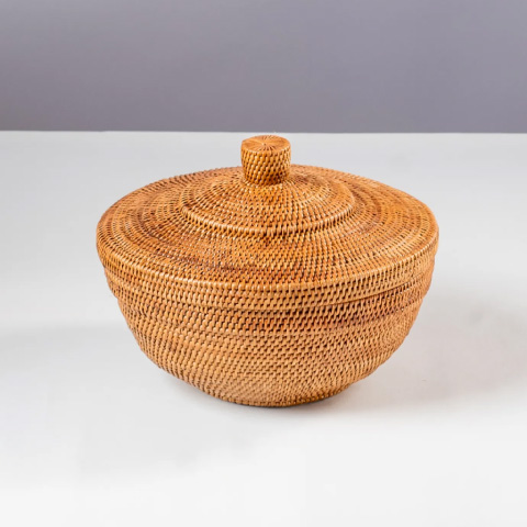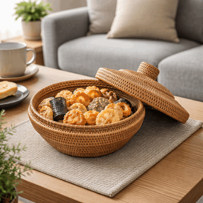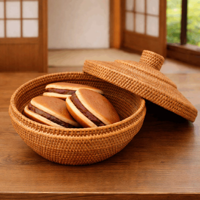 和菓子も焼き菓子も上品に整う、アタの蓋付き菓子器。上品感があります。来客の茶菓子や小物収納にも便利です。
